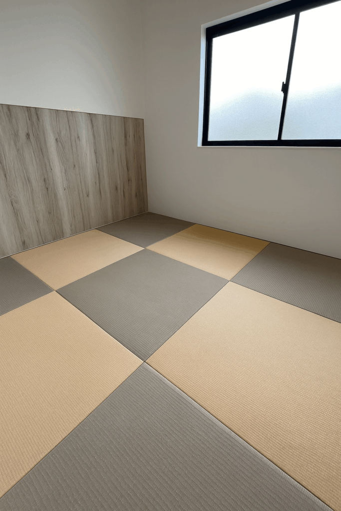 特に市松敷きにすることで、同じ色でも光の当たり方で濃淡が出て、お部屋に奥行きが生まれます。(今回は2色使いなので当然色は違います)💡「シンプルなのに高級感がある」と感じていただけるポイントです。
