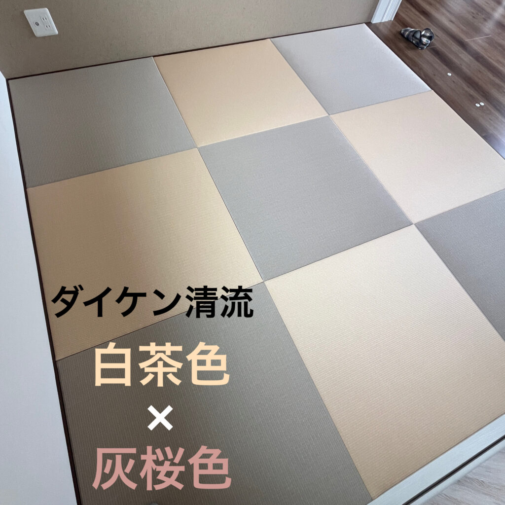今回の施工では、岐阜市宇佐のお客様宅にダイケン清流「灰桜色」と「白茶色」を使用したへりなし畳を納めました。